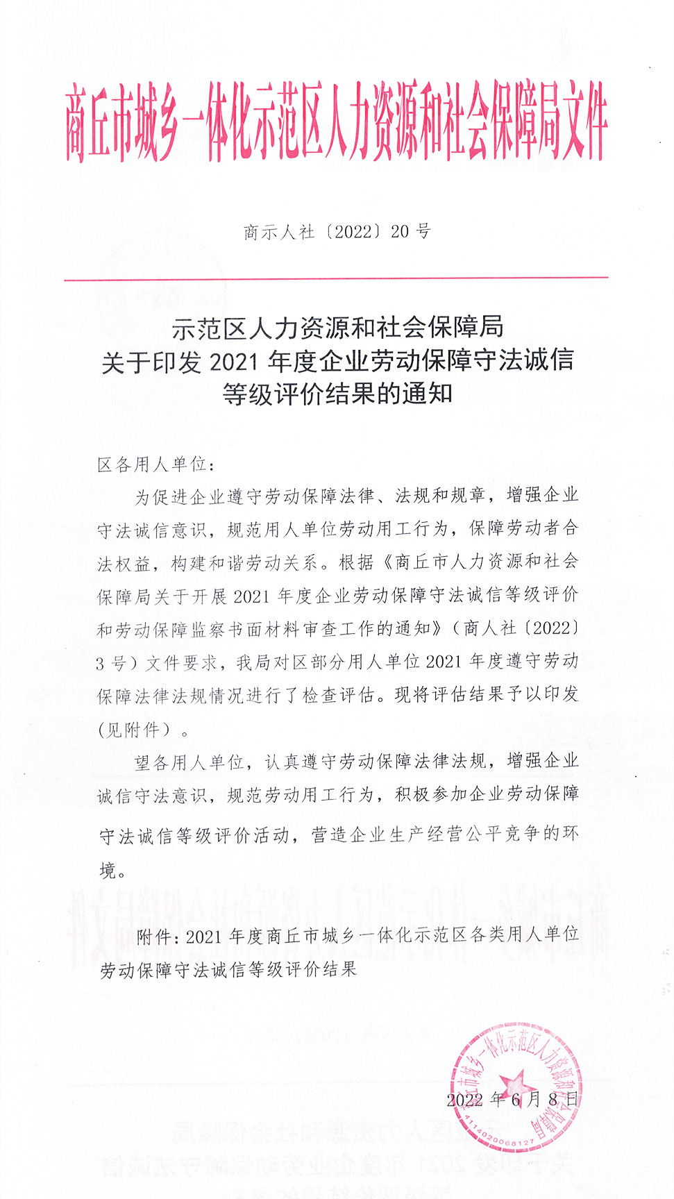 近日,商丘市示范區(qū)人力資源和社會(huì)保障局公布了《關(guān)于2021年度商丘市城鄉(xiāng)一體化示范區(qū)各類用人單位勞動(dòng)保障守法誠信等級(jí)評(píng)價(jià)結(jié)果》,我公司再次被評(píng)為示范區(qū)勞動(dòng)保障守法誠信A級(jí)示范單位,這一榮譽(yù)充分表明了勞動(dòng)保障部門對(duì)公司勞動(dòng)管理規(guī)范與員工權(quán)益保障等方面工作的充分肯定。